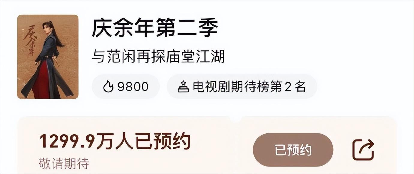 咱们可以看到,《长相念念》第二季是的预约东说念主数仍是冲破500万,而《庆余年》第二季的预约东说念主数是《长相念念》第二季的两倍,因为仍是达到1200万+,这个预约数足以讲授网友们对这部剧的眷注度。