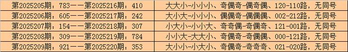 在罗列三历史开奖中,第2025205期-第2025209期结合5期奖号为:783-605-154-309-921。