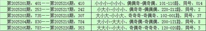 统计罗列三已开出的奖号发现,在结合5期(第2025201期-第2025205)奖号为:401-253-735-830-783。